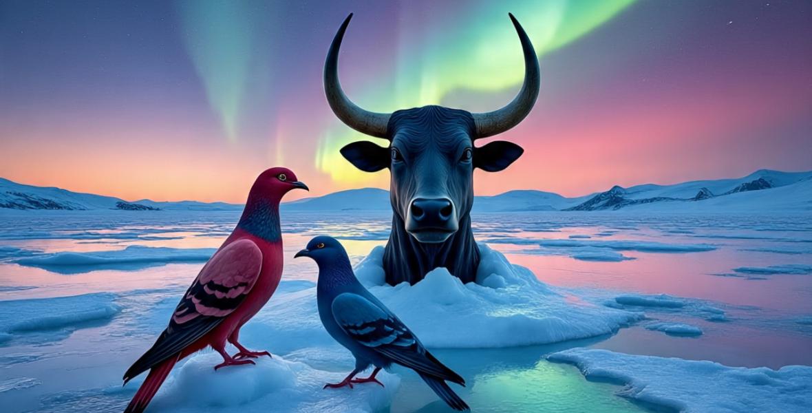 Había un hombre toro, pequeño, debajo del hielo, y encima había una aurora boreal que rodeaba una estrella. Del oeste venía una paloma roja y del este una paloma azul; iban a chocar, pero antes de encontrarse lograron esquivarse y no chocaron. Entonces, el hombre toro salió a la superficie y dijo: