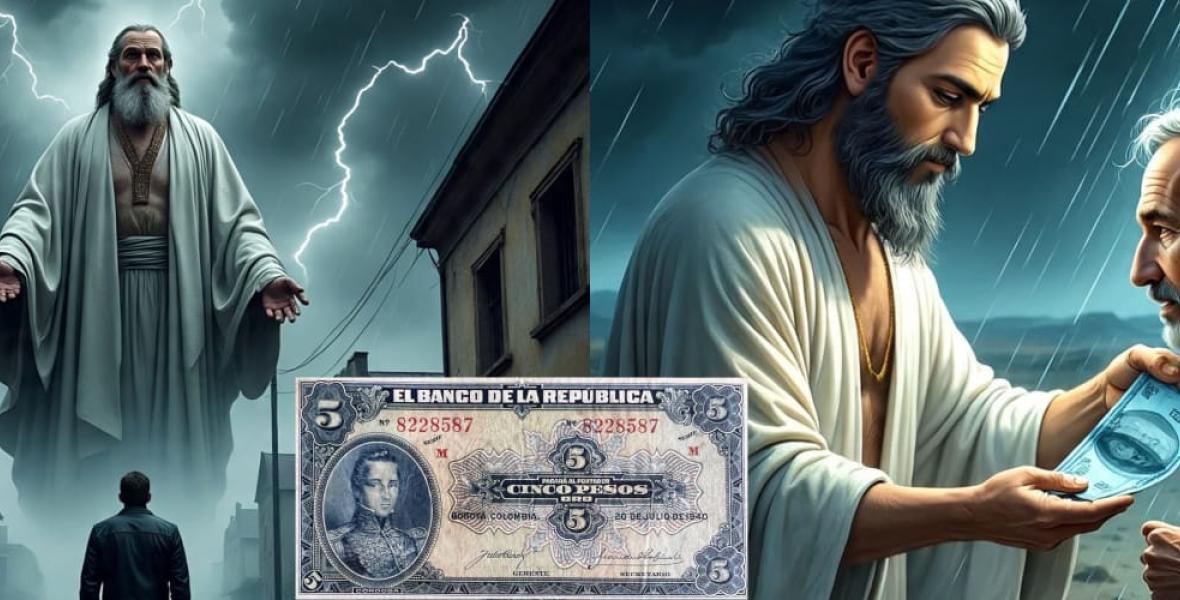 El rallador, es humanidad metalizada, sigue siendo pararrayo, expuesta a los rayos. El billete es la humanidad semilla, el remanente, toda la gente que se ha abrigado en Dios, cumple sus mandatos y respeta las leyes naturales, cósmicas y de orden deontológico en la sociedad. Ese billete de cinco pesos oro, el que representa a la humanidad, es el billete colombiano emitido por el Banco de la República, en 1940. En su anverso tiene un marco azul, con el 5 en las cuatro esquinas del billete. A la izquierda, en un óvalo, está el retrato del General José María Córdova, una figura decisiva en la Guerra de Independencia. Al lado del retrato, se extiende hasta el borde de la derecha, una especie de cruz más larga que alta, con un trasfondo verde claro grisáceo. En el centro de esa cruz, a lo largo de los brazos horizontales, en tres niveles, dice: