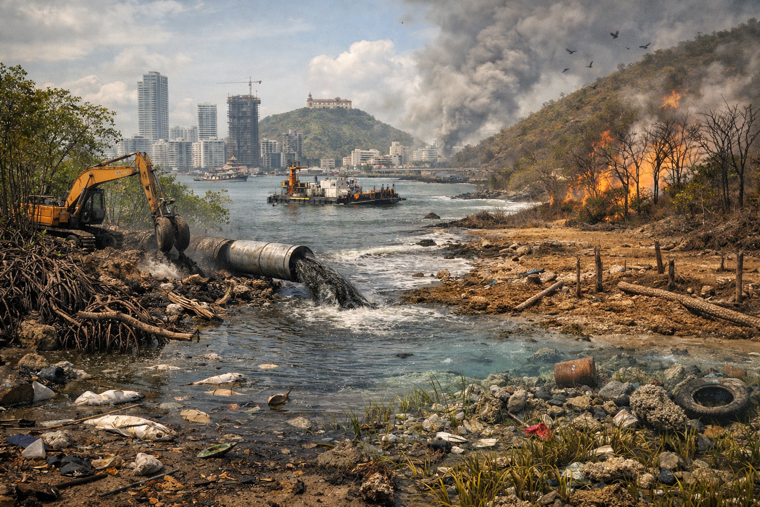 Y finalmente, cuando el daño sea evidente, o si quizás algo sobrevive, pierda cuidado y con gusto le recuerdo: organice un gran foro sobre sostenibilidad con aire acondicionado, coffee break, y expertos variados explicando cómo salvar lo que ya dejamos morir. Lleve su leal comité de aplausos, y asegúrese de que alcance la energía para que el clap sea armónicamente uniforme durante las, mínimo, dos horas de duración del evento. Imprima o suba a la nube unas memorias elegantes y prometa que ahora sí, una vez más, la ciudad entrará en una nueva era verde y azul. Nueva, pero no mejor; mucho menos, sin aprendizajes previos. No importa, porque las felicitaciones siempre ocultarán las corresponsabilidades. Nadie, o muy pocos, preguntarán demasiado por los islotes de manglar desaparecidos, por la bahía enferma o por las islas perdidas. Después de todo, destruir una ciudad costera requiere método, paciencia… y una extraordinaria capacidad para hablar de futuro mientras se borra el presente.